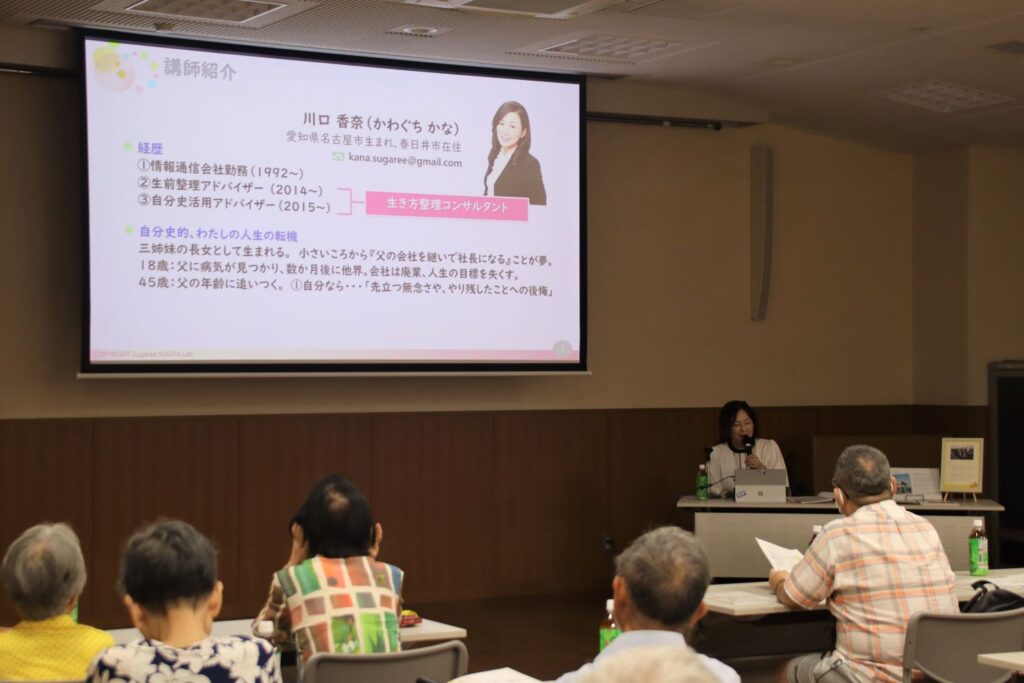 当日は、シュガリーいきかたラボの生き方整理コンサルタントである川口香奈代表を講師に招き、参加者へ生前整理やエンディングノートの書き方などについて講義を行いました。