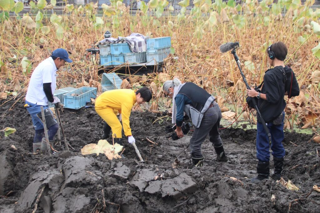 愛西市産のレンコンの特徴や収穫方法を紹介しながら、備中鍬を使用して土を掘り、1つ1つ丁寧に収穫する様子が取材されました。