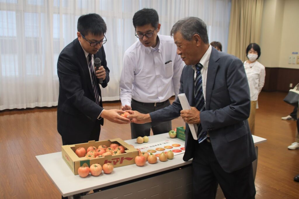 また、同会場で目揃え会を開催し、生産者と市場関係者らが実物のトマトを見ながら色づきや形状について規格を確認しました。