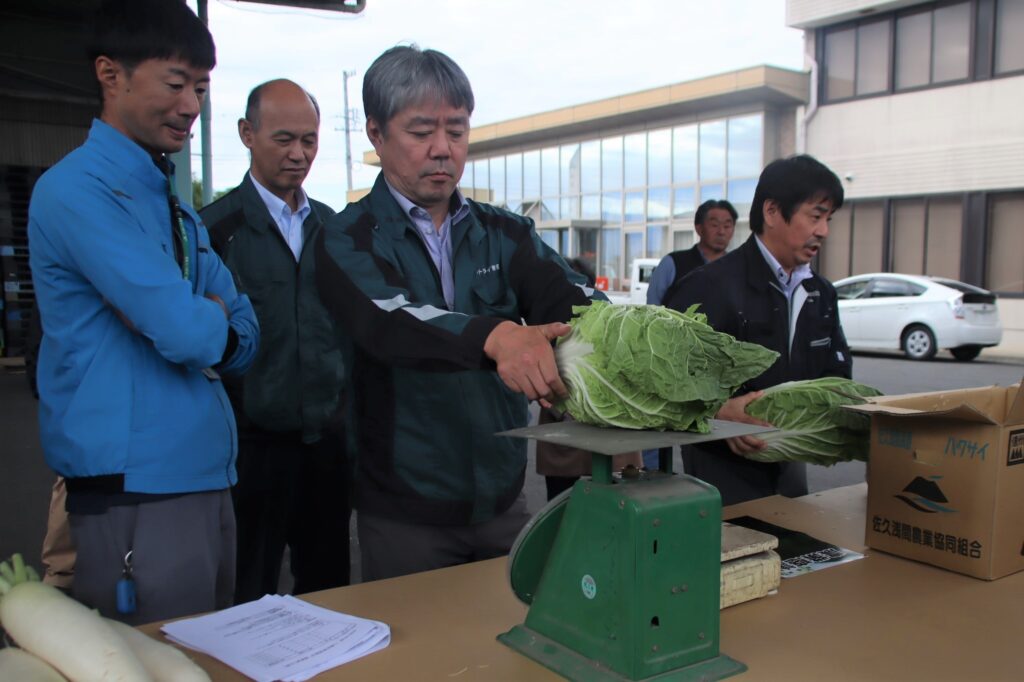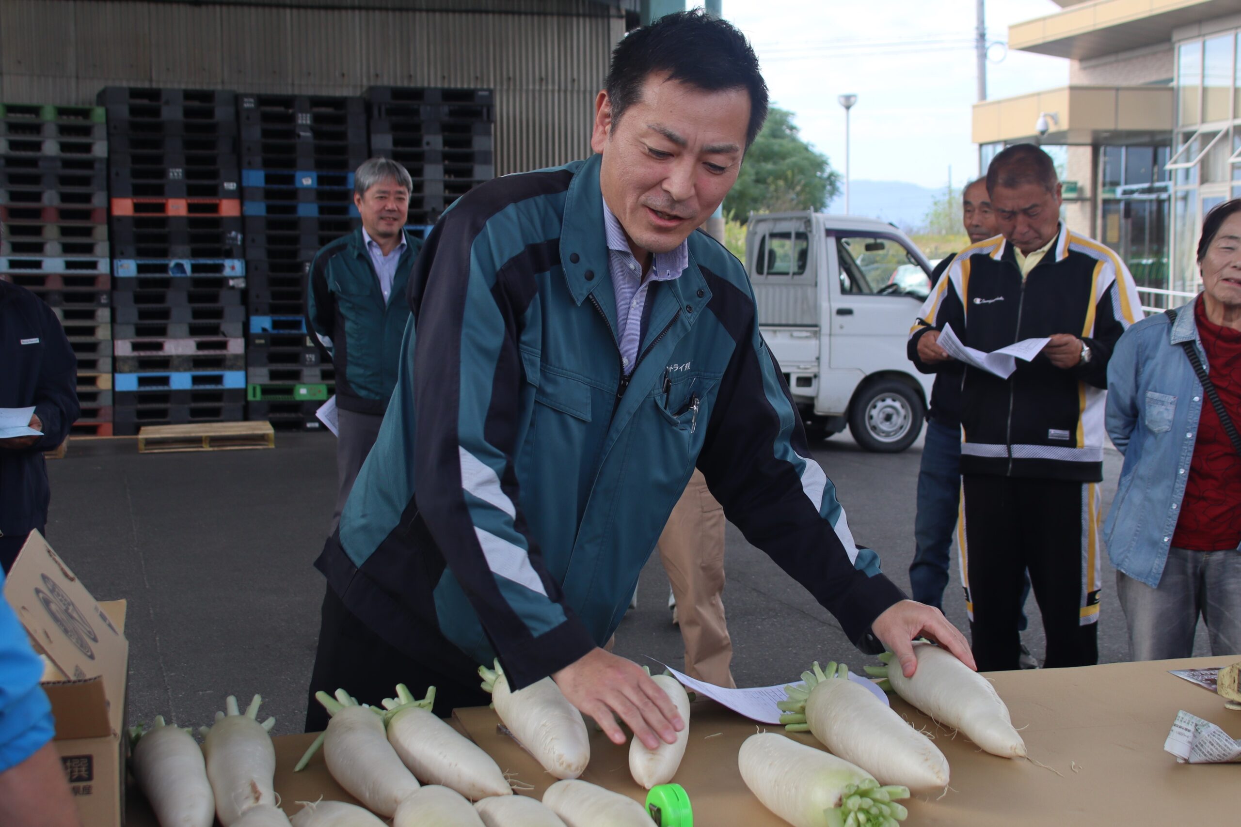 当日は、初めに渡邉安生組合長の挨拶や市場関係者らからの市況報告などが行われました。その後、秋野菜の目揃え会を行い、市場関係者らが秋ダイコンとハクサイの実物を使用して重さや長さ、品質などの出荷規格を説明しました。