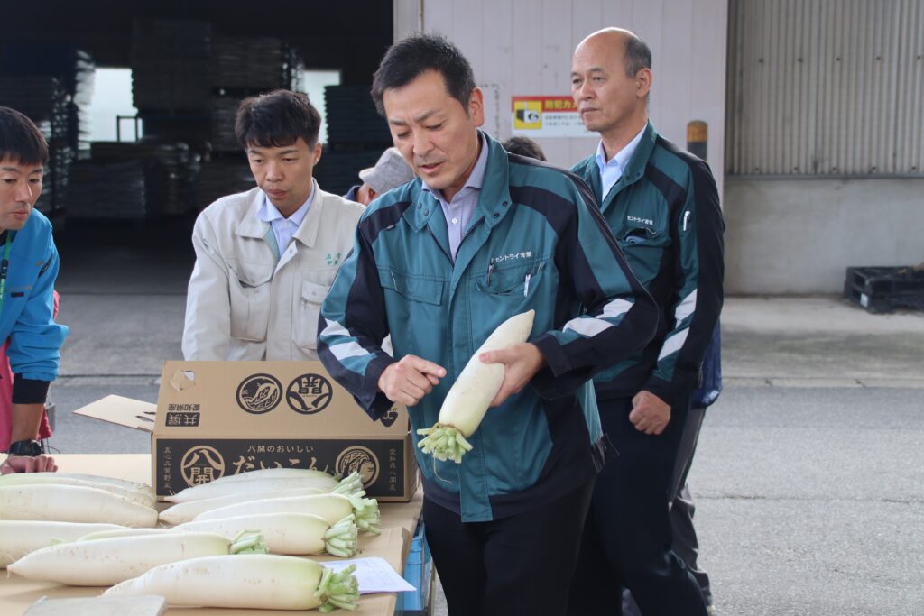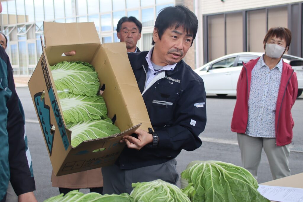 同組合は生産者25戸が約600アールで秋ダイコン、ハクサイ、キャベツ、サツマイモなどの5品目を栽培しています。