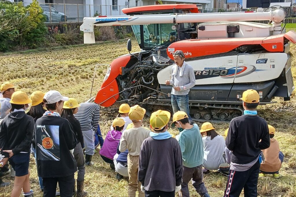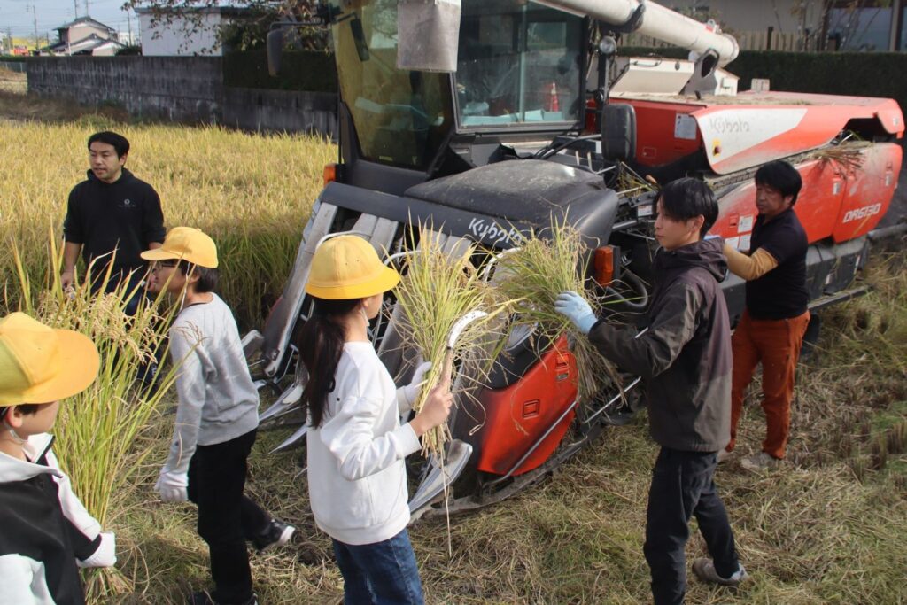 また、その場でコンバインへ持ち運んで脱穀を行うとともに、コンバインによる刈り取りの実演も行われ、手作業と機械による収穫の違いも学びました。