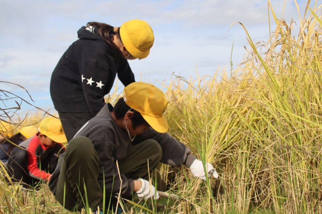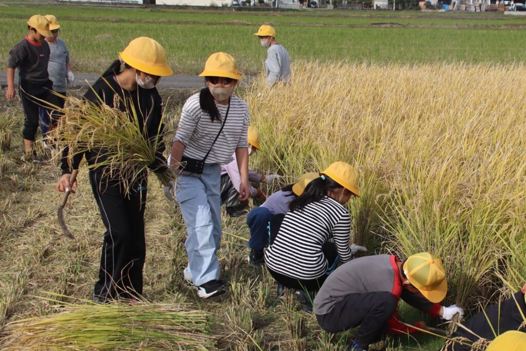 初めに、児童らへ稲刈りの方法や鎌を使用する際の注意点などについて説明した後に収穫に取り組み、ケガをしないように注意しながら一株ずつ稲を刈り取って収穫を楽しみました。