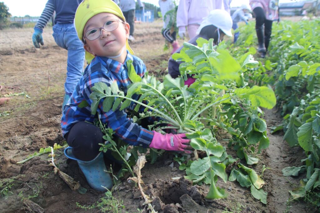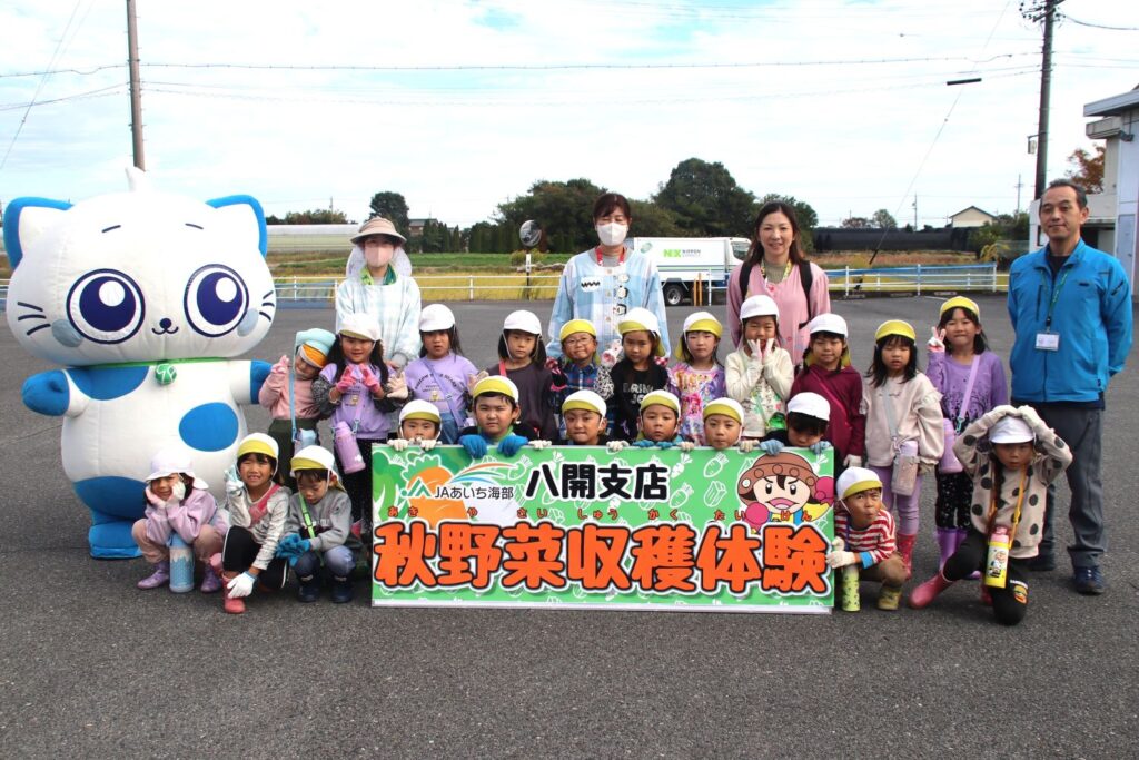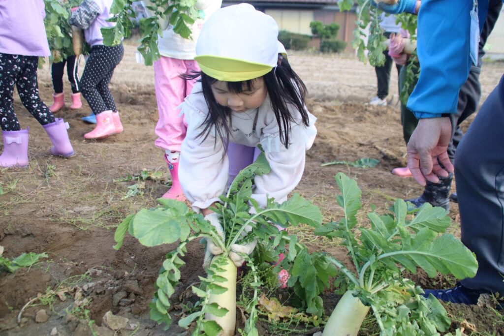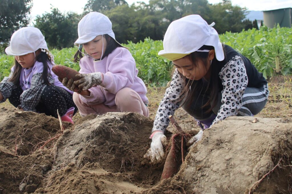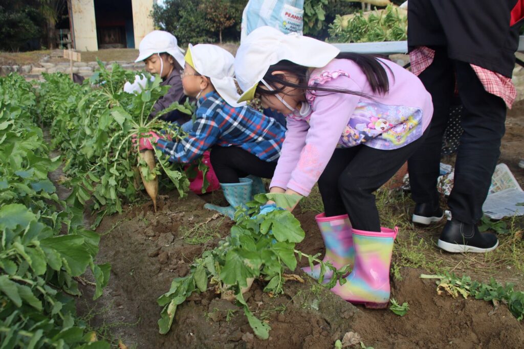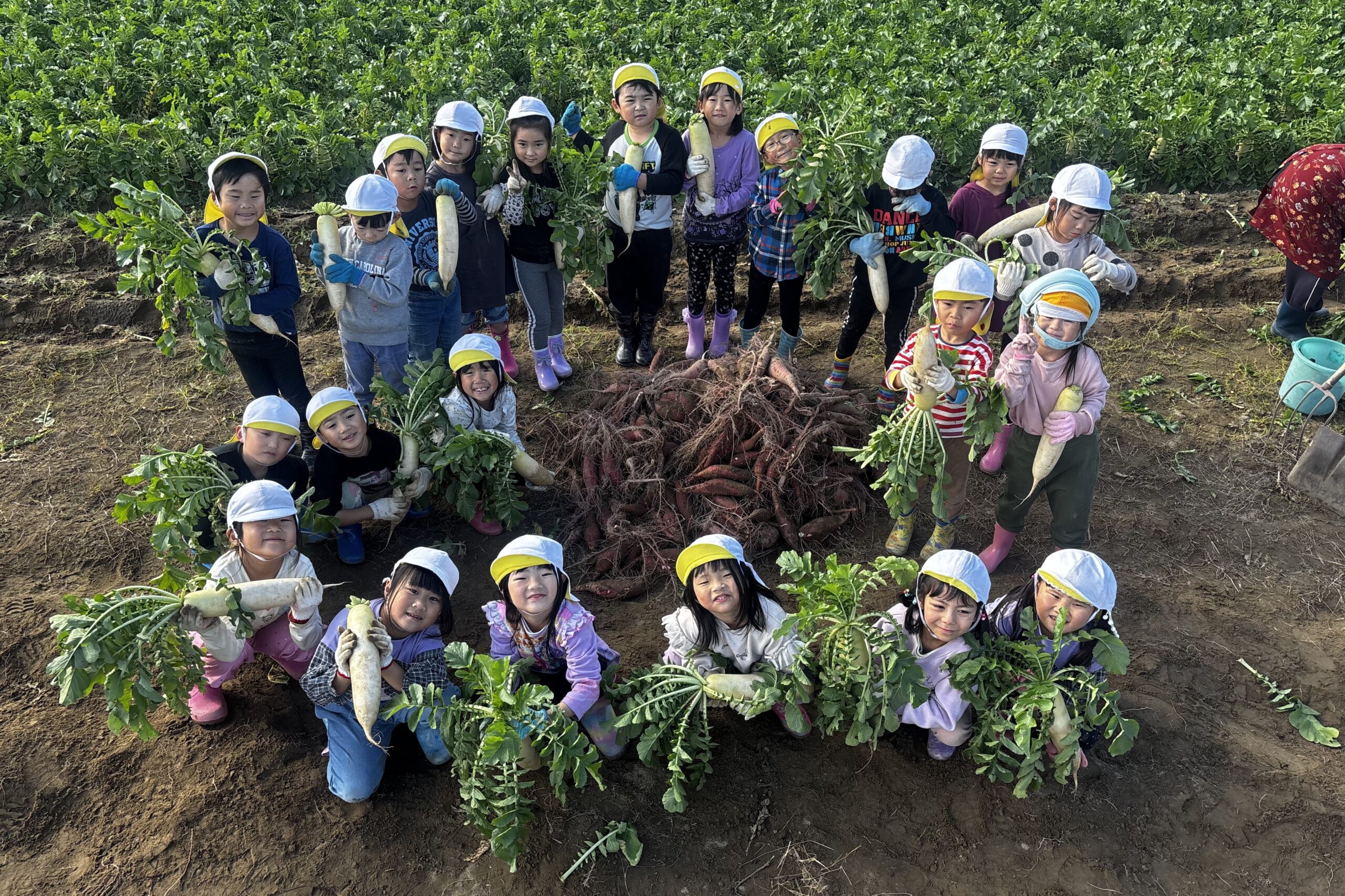 八開支店は11月11日、同支店の圃場にてサツマイモとダイコンの収穫体験を開催し、白百合保育園と丸島保育園の園児約47名が参加しました。
