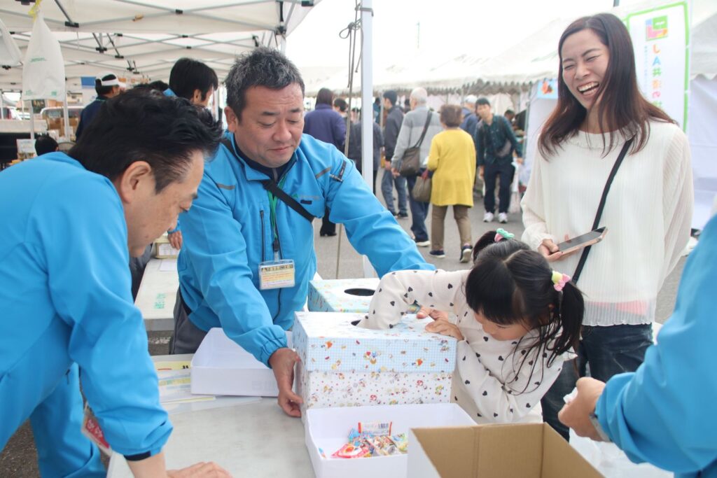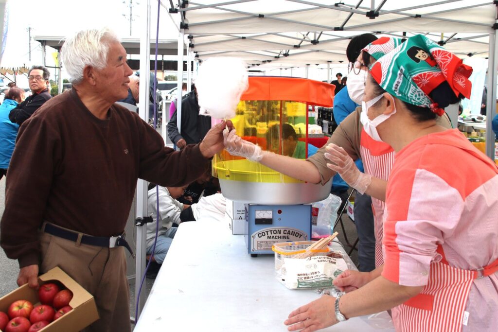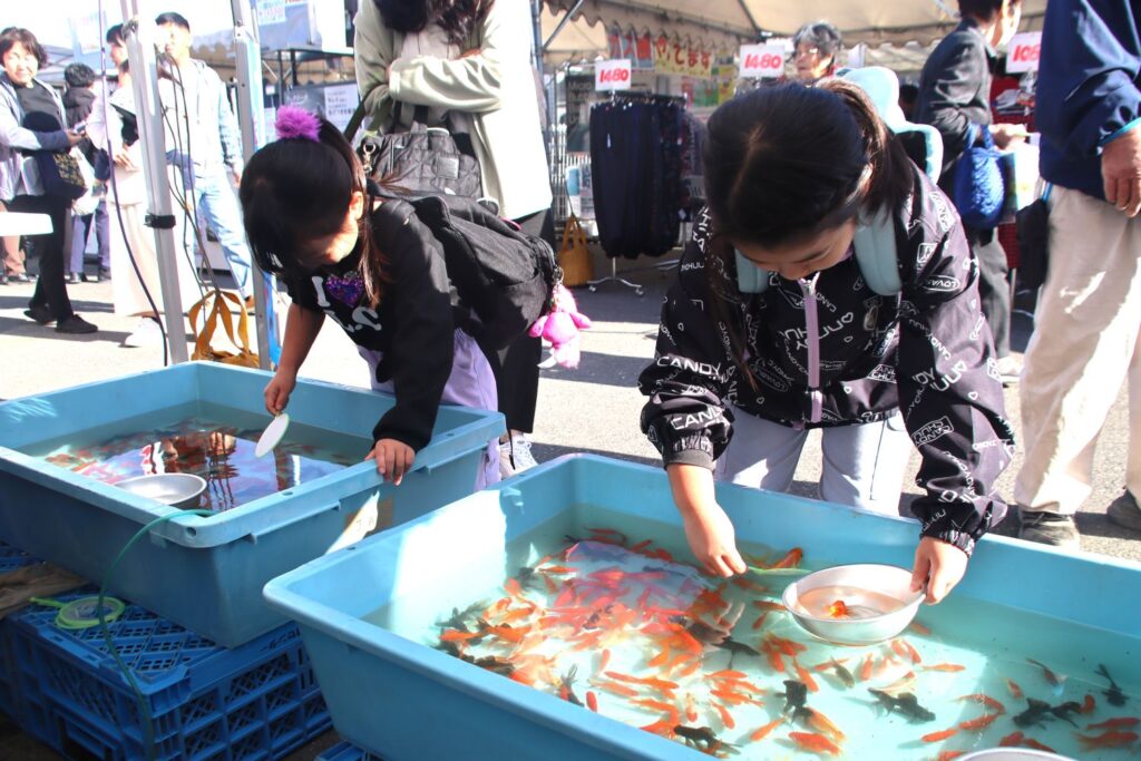 当日は、子ども達が楽しめるお菓子つかみ取りや同市の特産の金魚を使用した金魚すくい、管内の特産物の販売、女性部による豚汁や綿菓子の無料配布などが行われました。