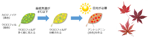紅葉は、最低気温が8℃以下になると始まって、寒くなるにつれて進みます。昼夜の気温差が大きく、日光がよく当たると、鮮やかな紅葉となります。