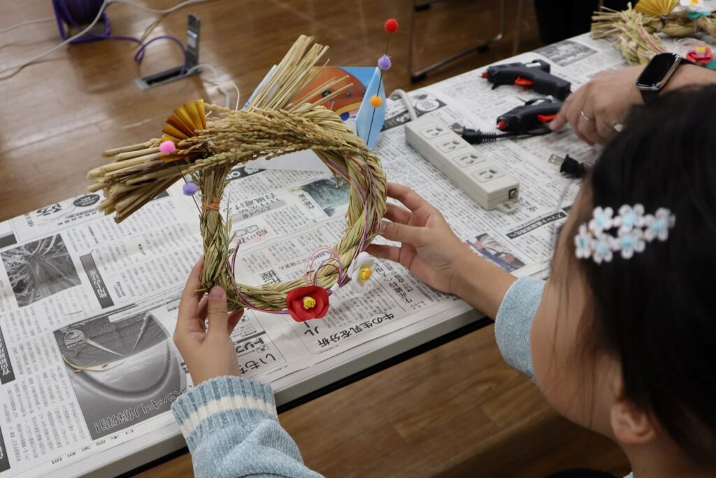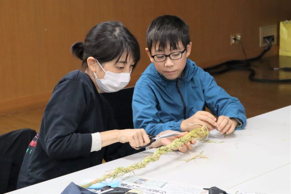 参加者は親子で協力し、稲わらの束を傘袋に入れ、水を差して揉み込んだあと、すりこぎで叩いて柔らかくしました。その後、3等分にした稲わらをしめ縄に綯うポイント映像を見ながらリース型に整え、水引や稲穂、餅花などの飾りを取り付けて仕上げました。