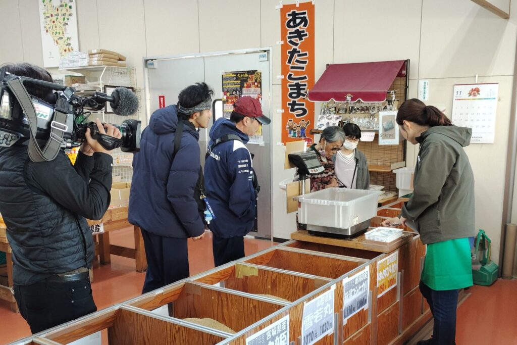 当日は、昨今の食品の価格高騰が続く中で、お米の特売やお手ごろな価格で野菜を販売する産直施設としてグリーンプラザが紹介され、店舗内やお米等を買い求めるお客様で賑わう様子が取材されました。