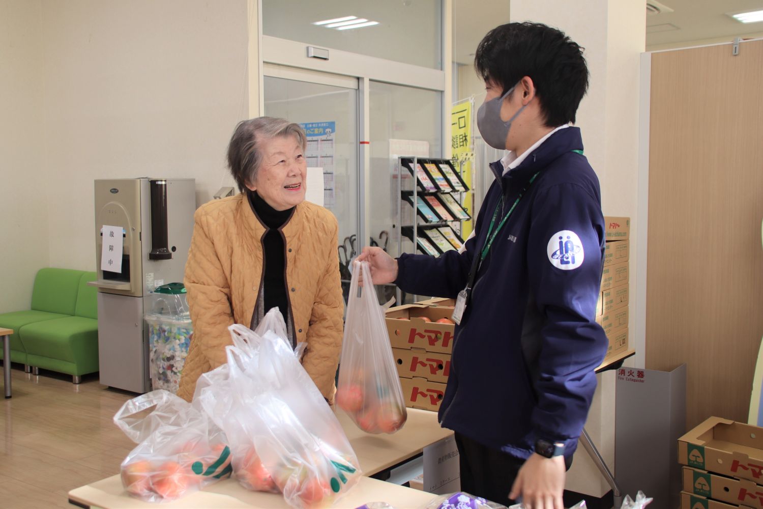 この取り組みは支店を通じた地域住民のJA事業に対する理解促進を目的に開催しており、この日はトマトやレンコンなど当JA管内の特産物と季節の果物が並びました。
