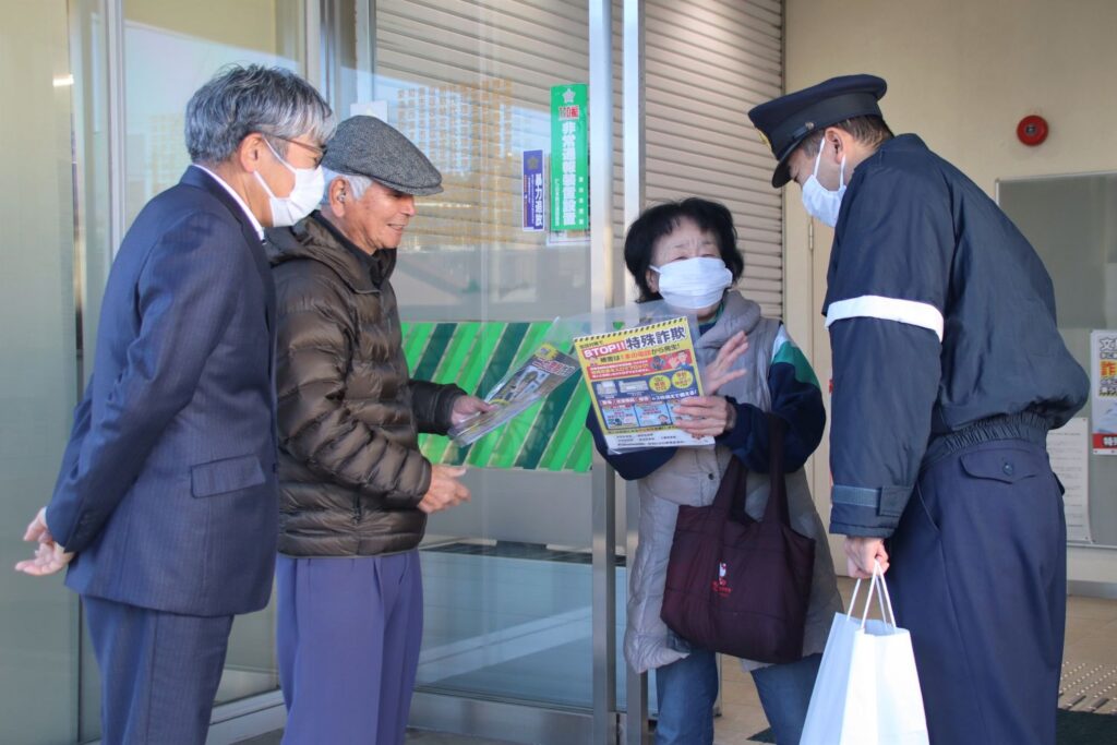 当日は年金受給日で多くのATM利用者が訪れ、店舗入り口にて職員や同会の役員、警察官らで注意喚起チラシを手渡しながら被害の未然防止を呼びかけました。
