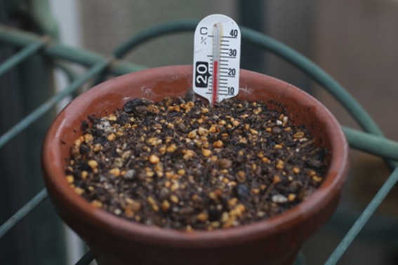 専用の地温計が正確です。普通の棒状の温度計でも測れないことはありません。土に穴をあけ、測りたい深さまで差し込み、土を寄せます。土の温度になじむまで待ちます(5分以上)。この時、温度計本体に直射日光が当たって温まらないように影の下で測ります。