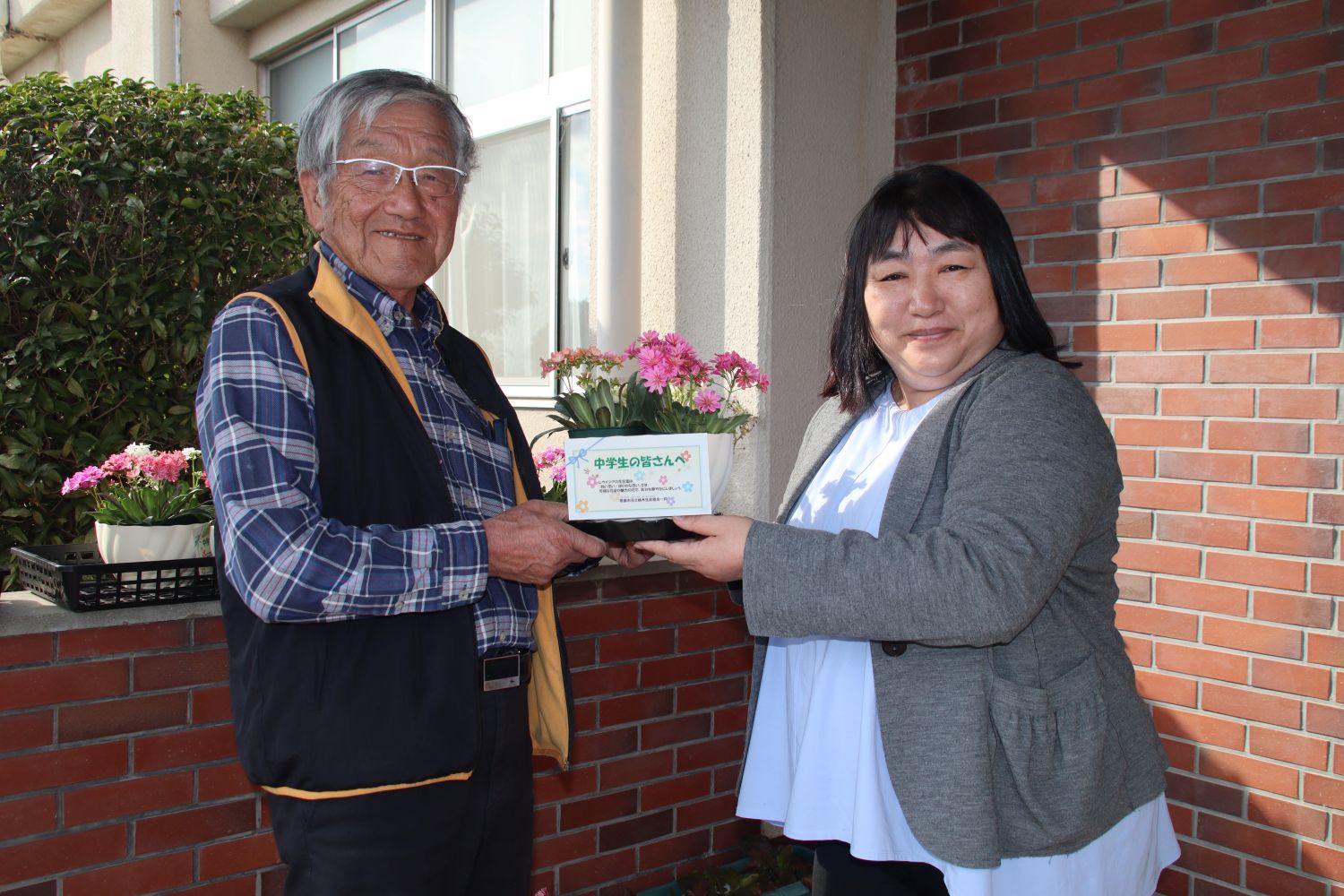 愛西市花き植木生産組合は2月26日、同市にある中学校6校に65鉢のレウィシアを寄贈しました。同組合は、当JA管内の愛西市の花き生産者らで構成されています。この取り組みは、花育活動を通じて子どもたちの豊かな学びや成長を応援したいという思いから、同組合が学校に寄贈を申し出て実現したもので、今年で4回目となります。