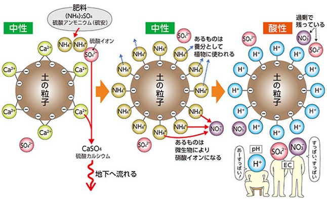 そして、化学肥料(硫安、塩安、塩化カリ、硫酸カリ等)を連用していると、作物が養分を吸ったあとに酸性成分(硫酸、塩酸)が残って酸性になります(図参照)。