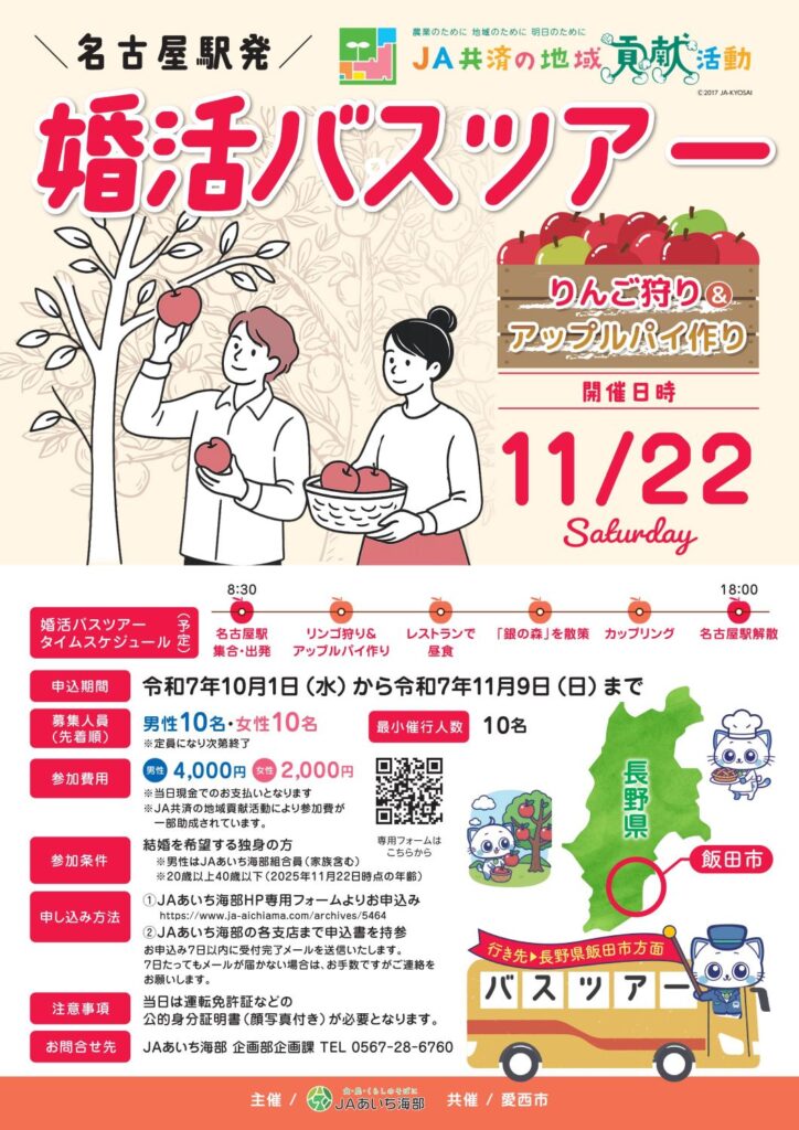 参加条件 | 結婚を希望する独身の方 ※男性はJAあいち海部組合員(家族含む) ※20歳以上40歳以下(2025年11月22日時点の年齢) ※定員になり次第締め切り(先着順) |